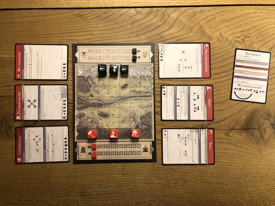 Each side of the dice shows the symbol of a creature and the corresponding power level (1-6). Players start by placing any creatures on the bottom row (supply zone) of their board until a total of power level 10 is reached. With this starting line-up, the players now take it in turns to perform one of the following actions: